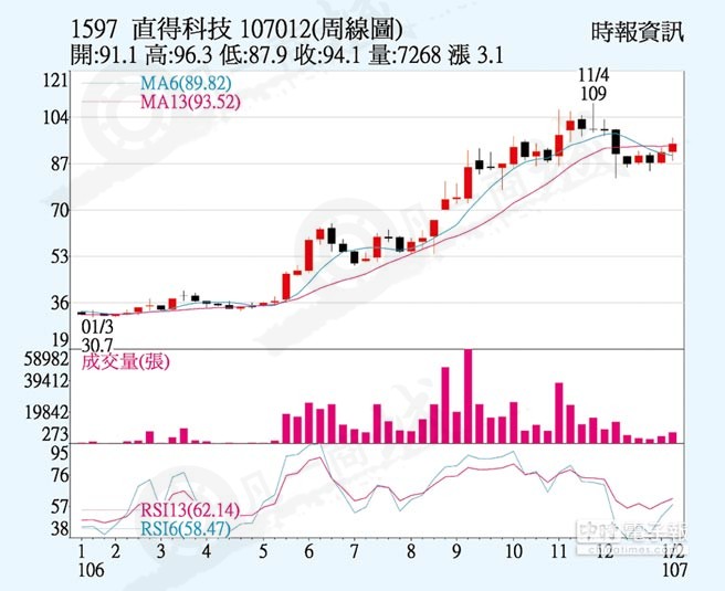 直得科技(CPC)去年因半導(dǎo)體、面板及光電等產(chǎn)業(yè)對智慧自動化及機(jī)器人需求殷切而受惠,去年合并營收逼近15億元,改寫歷史新高,市場預(yù)期CPC今年產(chǎn)能擴(kuò)增2、3成,營收及獲利可創(chuàng)新高,上周股價上漲5.5元而以94.1元收盤,周漲幅3.41%。