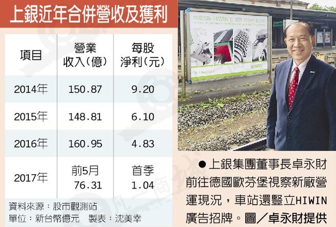 上銀集團董事長卓永財很早就預告,上銀第2季出貨優于首季,昨日公布自結5月合并營收16.9億元,再度改寫單月營收新高,年增14.04%;1至5月合并營收76.31億元,年成長31.78%,創同期新高。卓永財認為,上銀每次參展,訂單都是堆迭性成長,各行各業看到上銀HIWIN攤位展出機器人、次世代智慧滾珠絲桿、直線導軌等產品,下一次研發創新產品,就會找上銀合作。