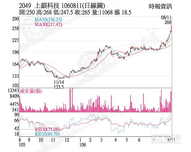 上銀科技(2049)7月合并營(yíng)收,締造連續(xù)第5個(gè)月單月新高佳績(jī),法說(shuō)會(huì)報(bào)喜訊,明年首季訂單滿載,外資法人相繼調(diào)高目標(biāo)價(jià)從235-315元不等,還調(diào)升評(píng)等至優(yōu)于大盤,11日成交爆大量,開高走高,逆勢(shì)上漲18.5元以265元收盤,創(chuàng)2015年4月以來(lái)新高。