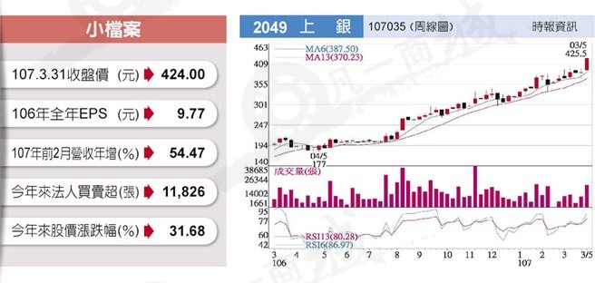 上銀花費6、7年時間,開發電動汽車轉向器關鍵零組件所需特殊螺桿加齒輪,預計8月試量產,跨足電動車領域。上銀去年合并營收211.65億元攀史上新高,毛利率回升至35.83%,去年認列匯兌收益2,900萬元挹注,EPS從前年4.83元倍增至9.77元創歷史次高。