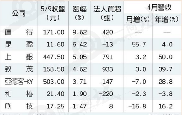 智慧機械題材再度熱炒,搭上4月營收業(yè)績揭露,指標股上銀科技、亞德客分別年增50%、28.8%,上銀創(chuàng)下歷史新高,帶動機器人概念股多頭點火,直得科技一度攻上漲停、大漲9.62%,上銀、亞德客都漲逾3%。