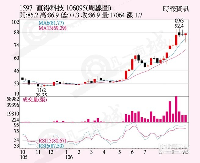 直得科技(cpc)生產微型直線導軌為主,因智能型手機及半導體設備商需求殷切,前7月EPS攀升至1.59元,法人預期全年EPS具有挑戰2元以上實力,上周六成交爆大量,推升股價至漲停86.9元收盤,上漲7.9元,突破5日、月線及季線反壓套牢區,上周漲幅2.0%。