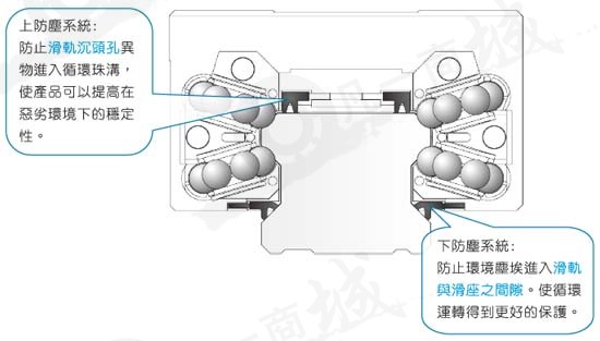 上防塵系統:上防塵系統即是針對滑軌沉頭固定孔之塵埃作防塵動作,上防塵即利用橡膠刮刷片,使滑軌上沉頭固定孔之塵埃,無法進入循環珠溝,使上排珠的循環異物問題更加減少。