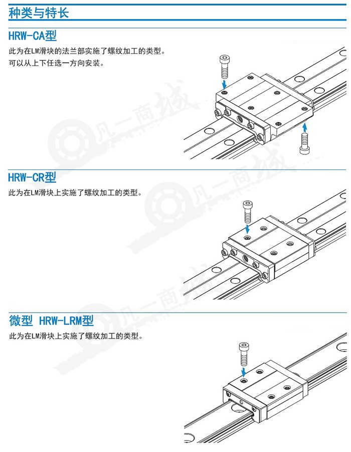 LM滑塊采用保持板精鋼球保持住,因此即使從,LM軌道中抽出來LM滑塊也不會脫落。(HRW12和14LR型除外)