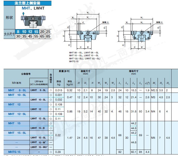 IKO導軌LWH系列的滑塊以法蘭型為主,還有寬度窄的方塊型、橫向安裝型等共5種類型,滑塊長度在相同的截面尺寸下有3種不同的類型,用戶可根據機械、裝置的規格選擇最合適的產品。